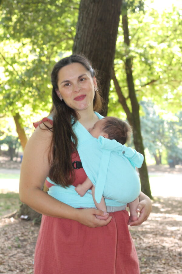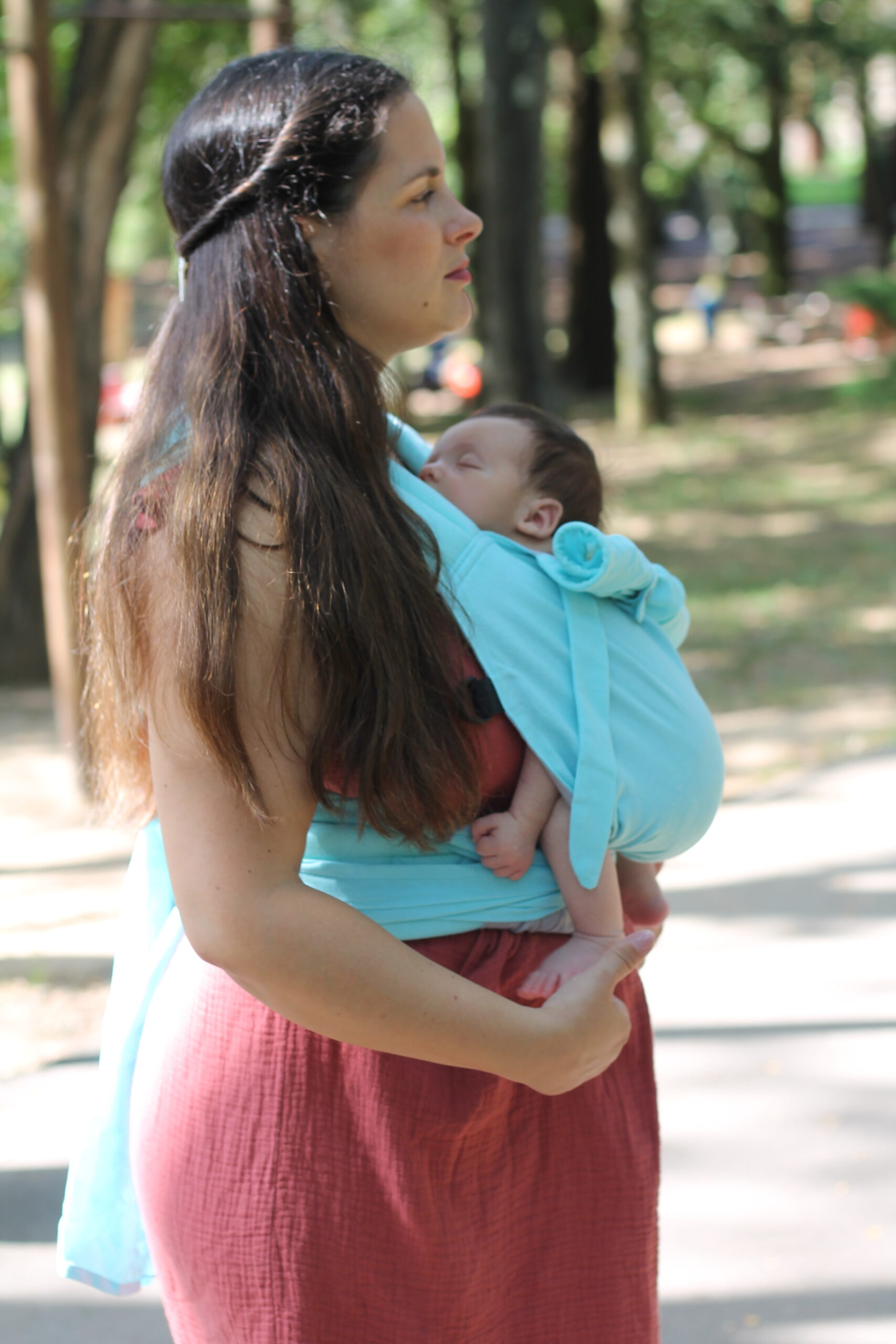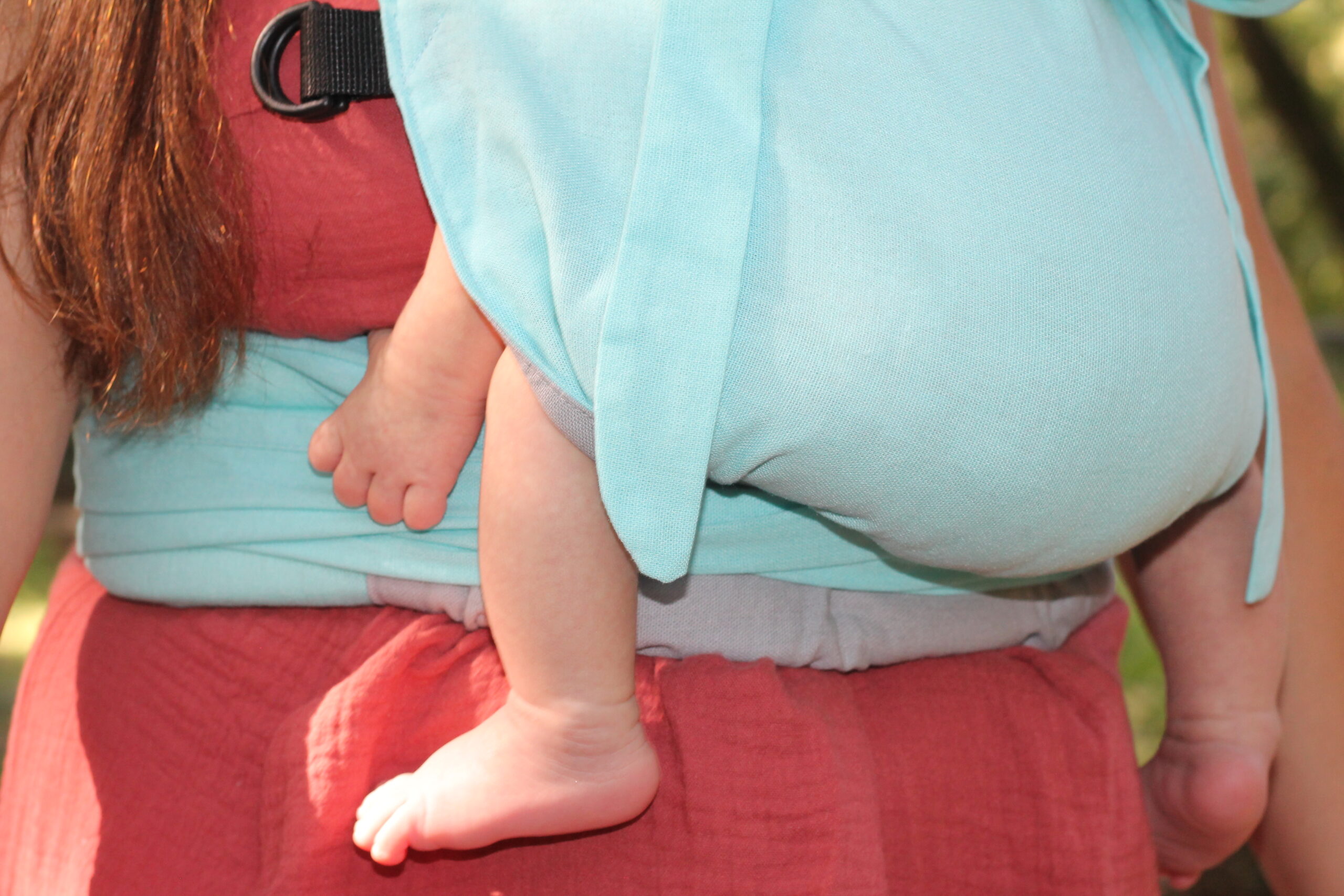 Pés sempre para fora, cabeça segura, bacia basculada e joelhos acima do rabinho. O pano deve ajustar-se bem ao corpo, sem folgas. Após os 6 meses, é possível carregar o bebé também nas costas.