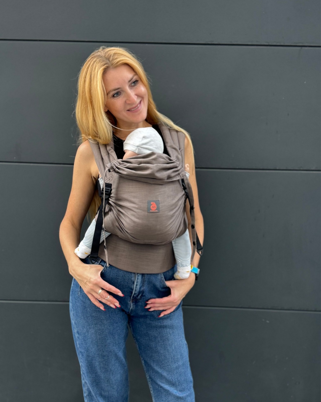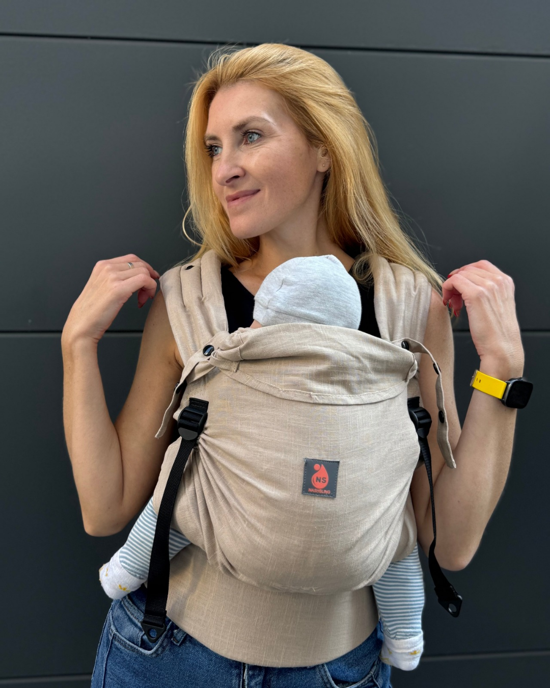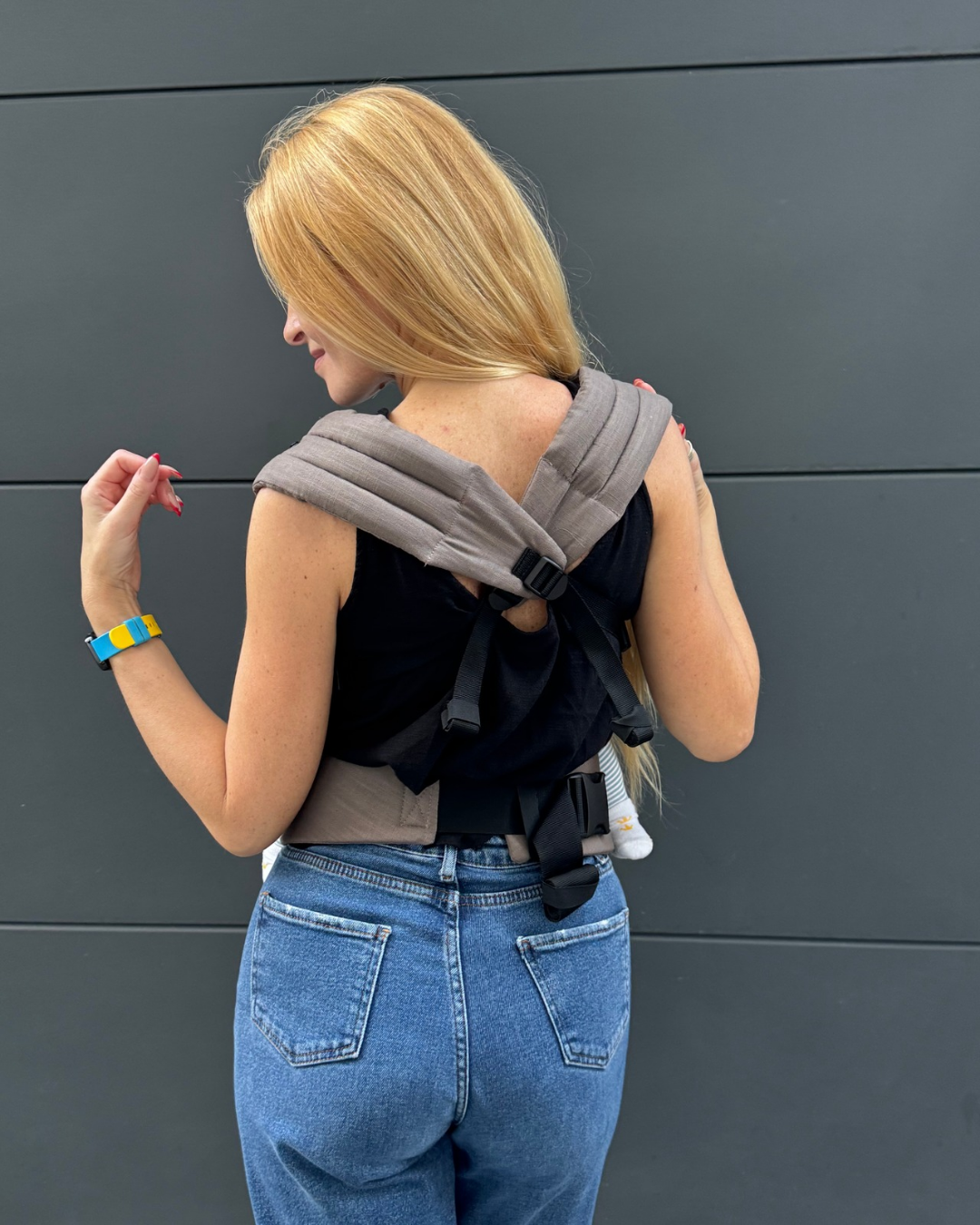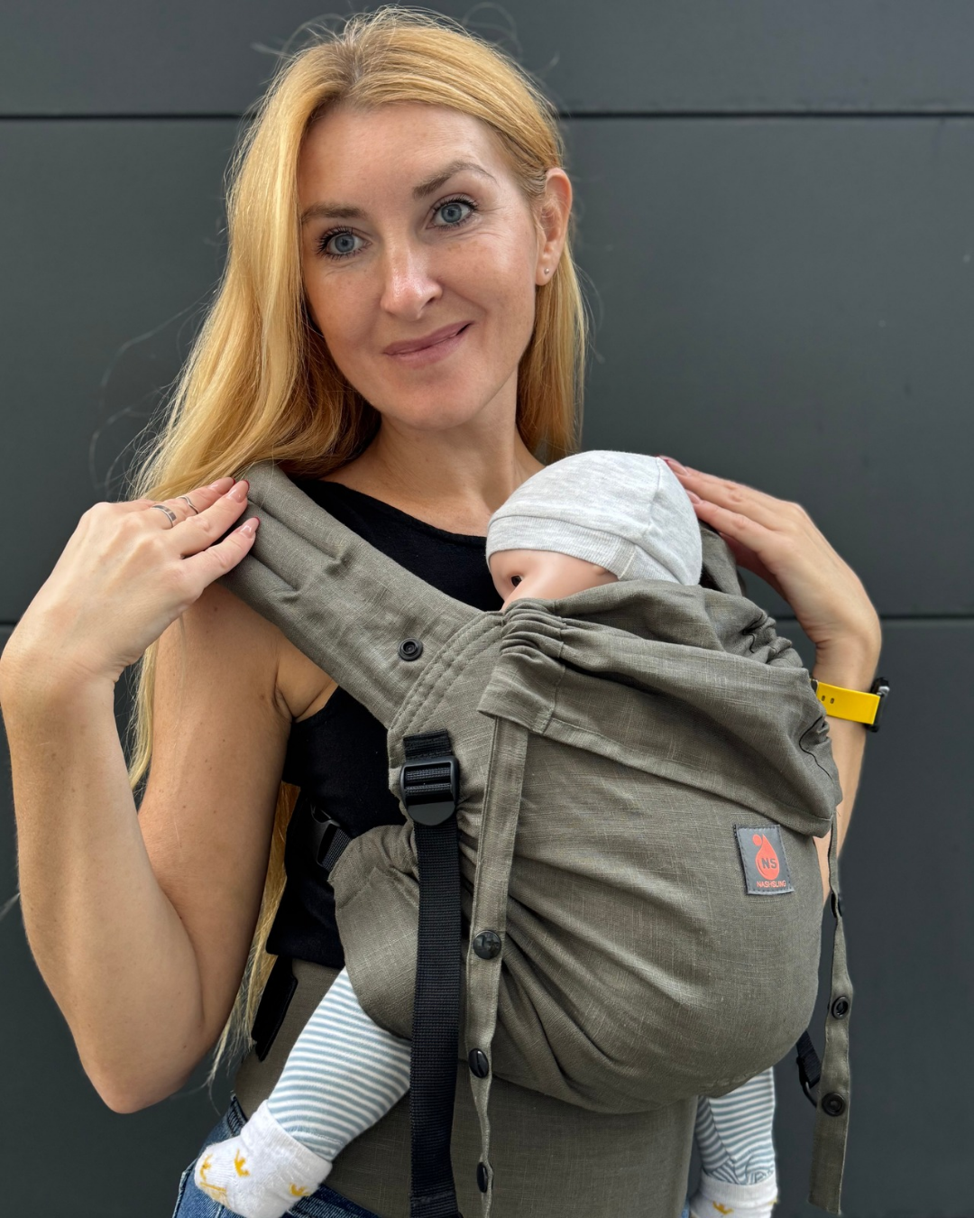 Mochila ergonómica ajustável para bebés de 4–16 kg, confortável e segura, feita com tecido de linho respirável. Ideal para várias posições: frontal, nas costas ou na anca.