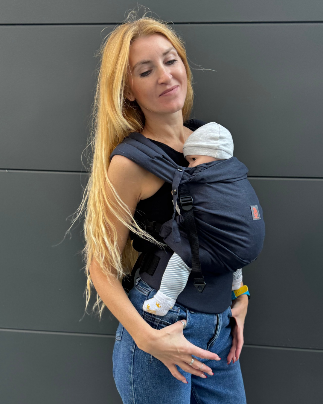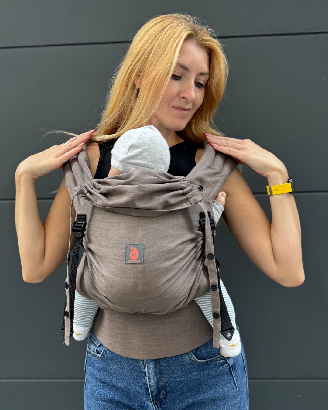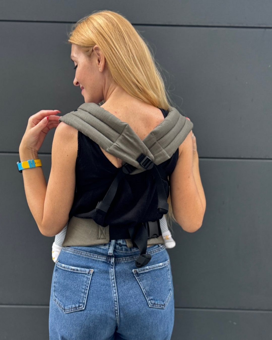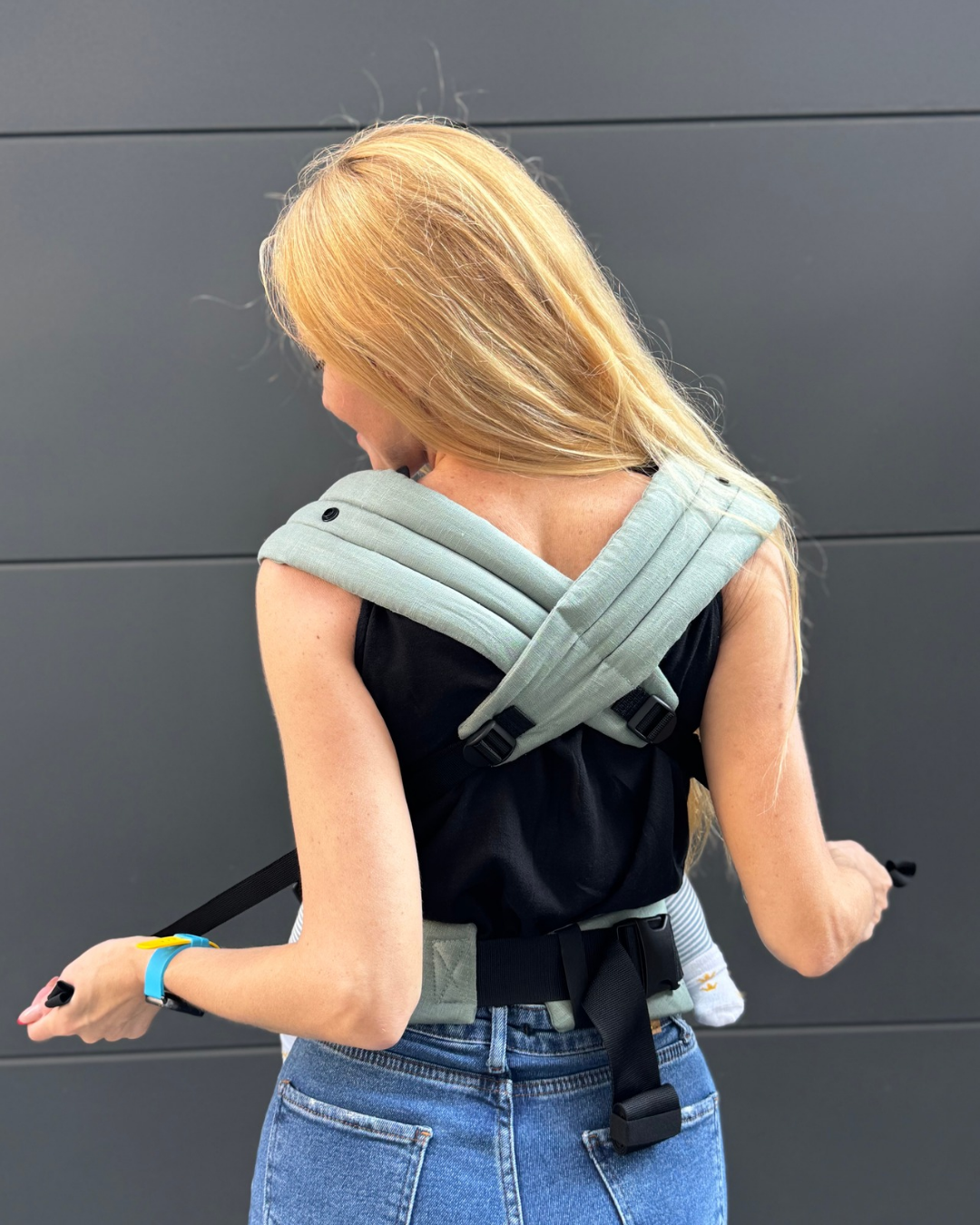 Mochila ergonómica ajustável para bebés de 4–16 kg, confortável e segura, feita com tecido de linho respirável. Ideal para várias posições: frontal, nas costas ou na anca.