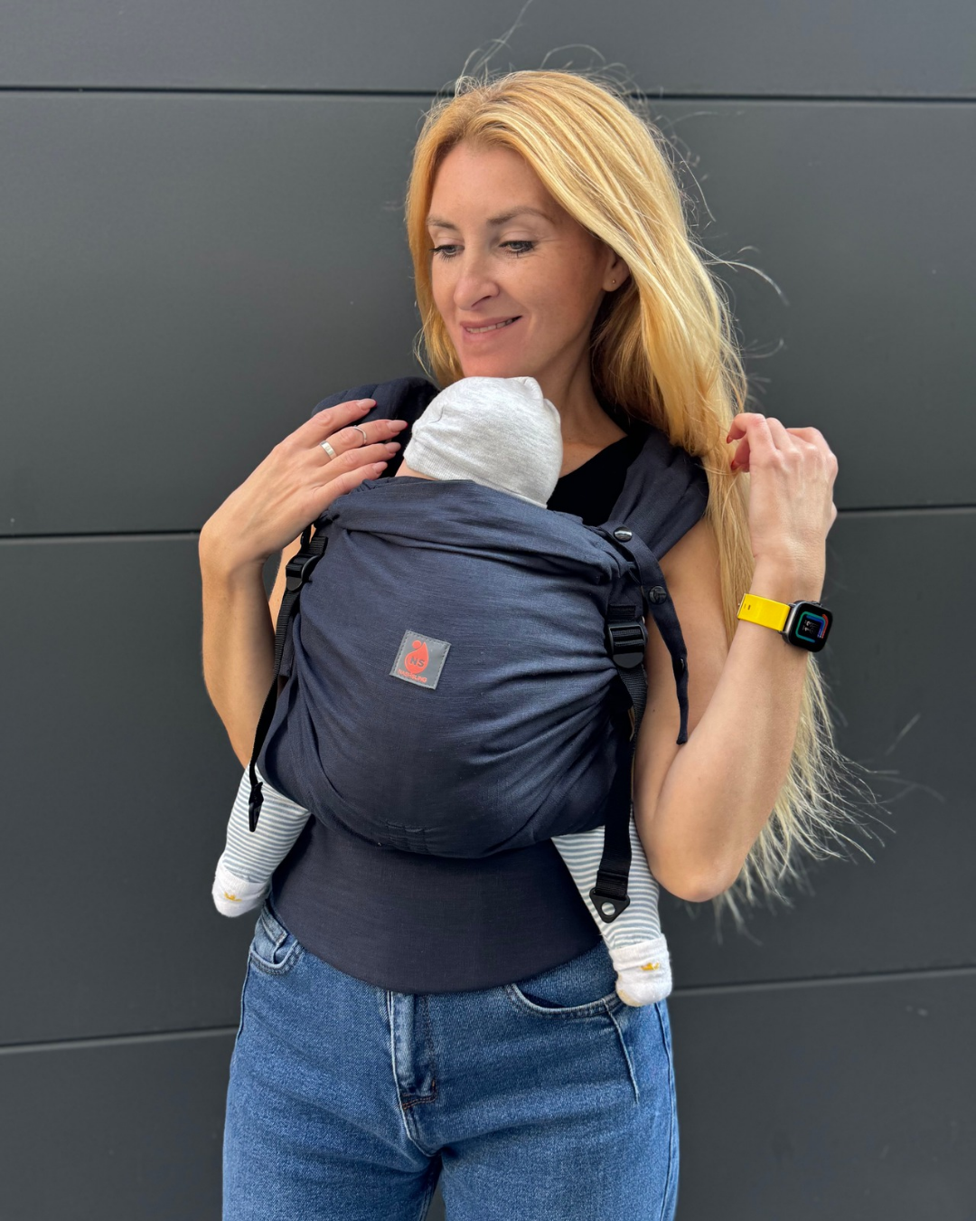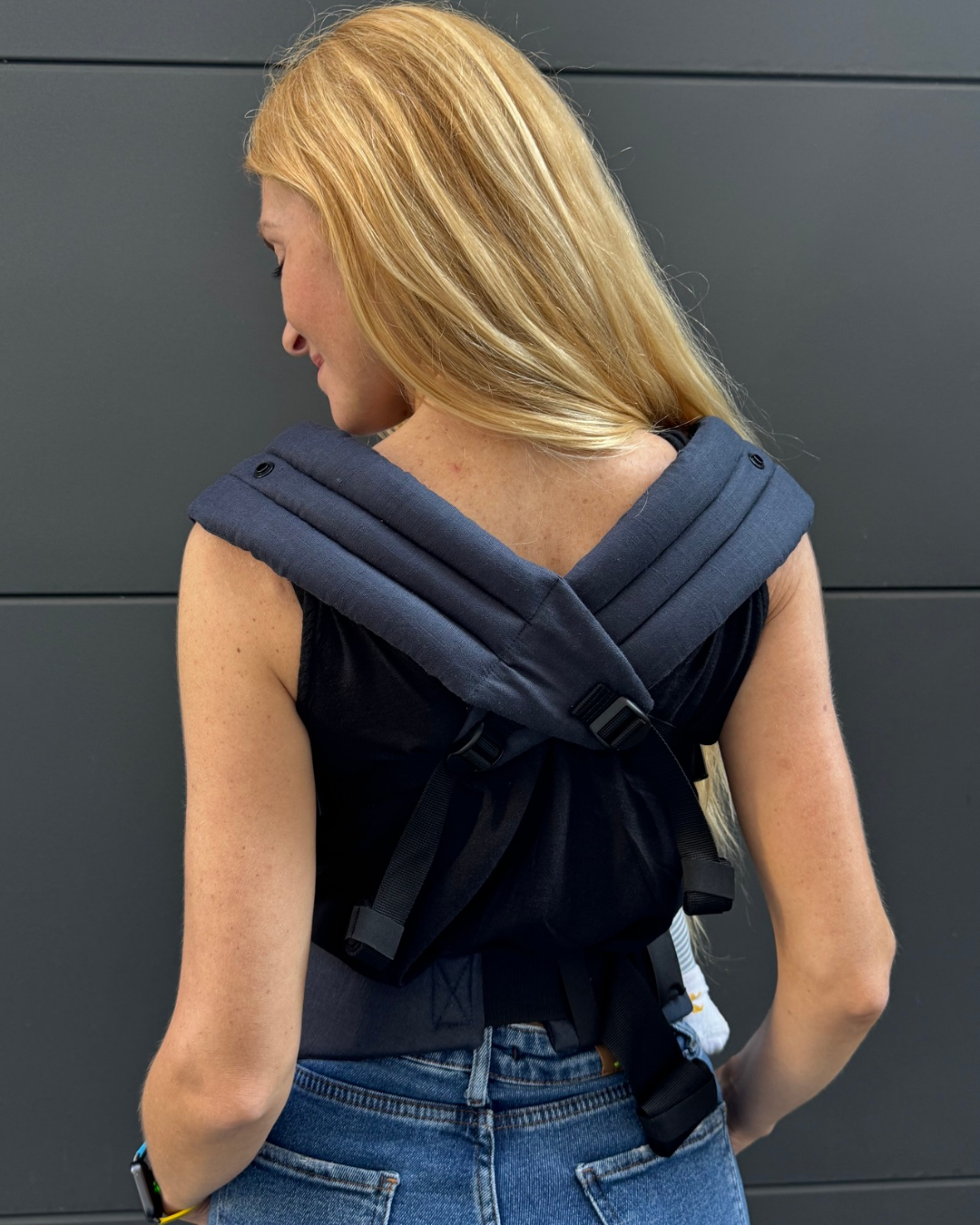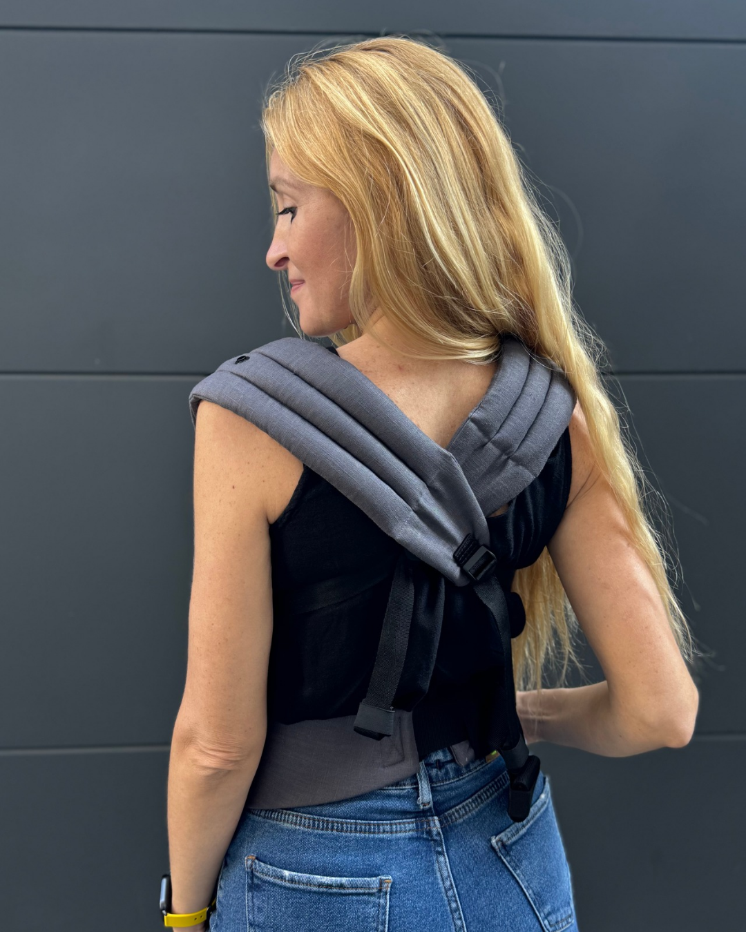 Adapta-se ao crescimento do bebé e altura do cuidador, com duas posições, fechando alças por cima da perna ou por baixo , fáceis de usar.