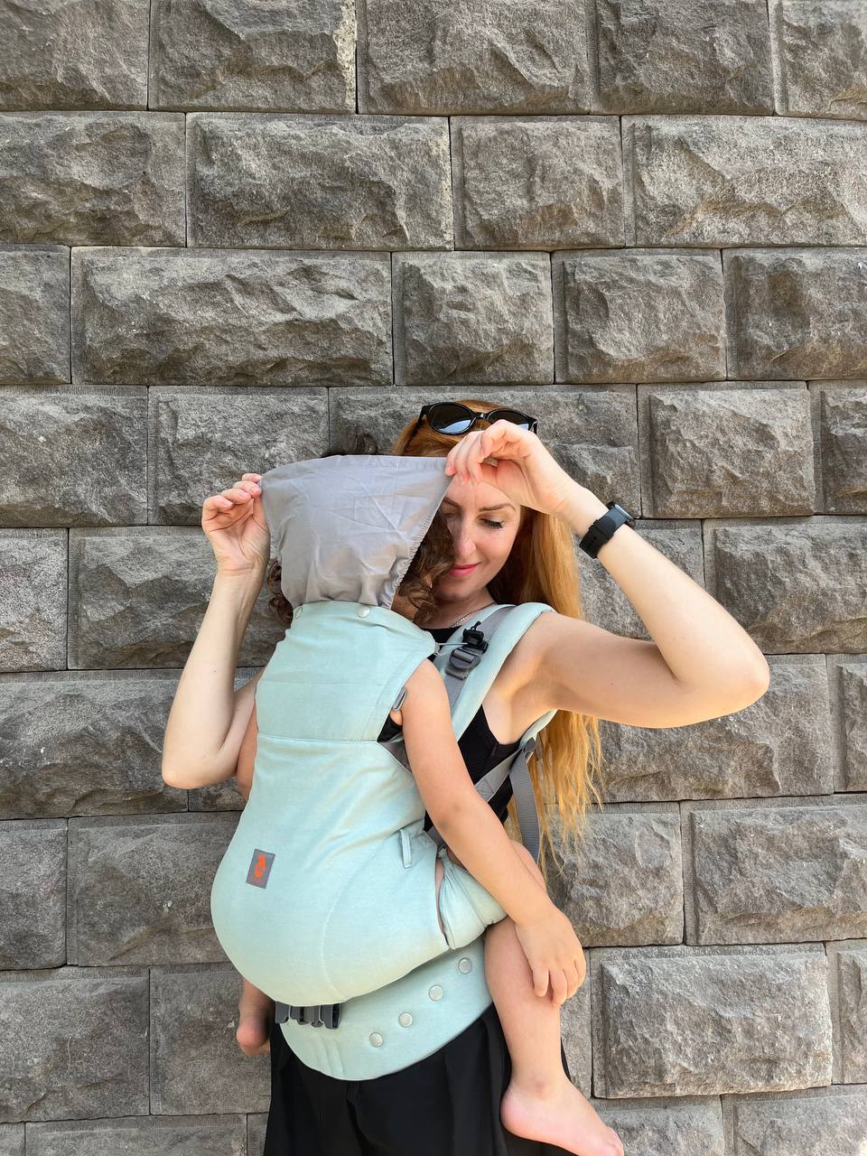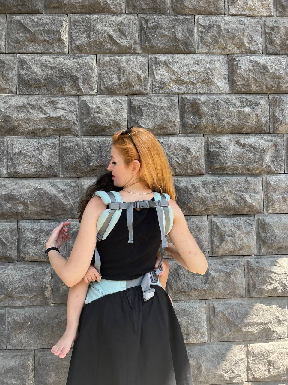 - Cabeça segura e fora do porta-bebés;