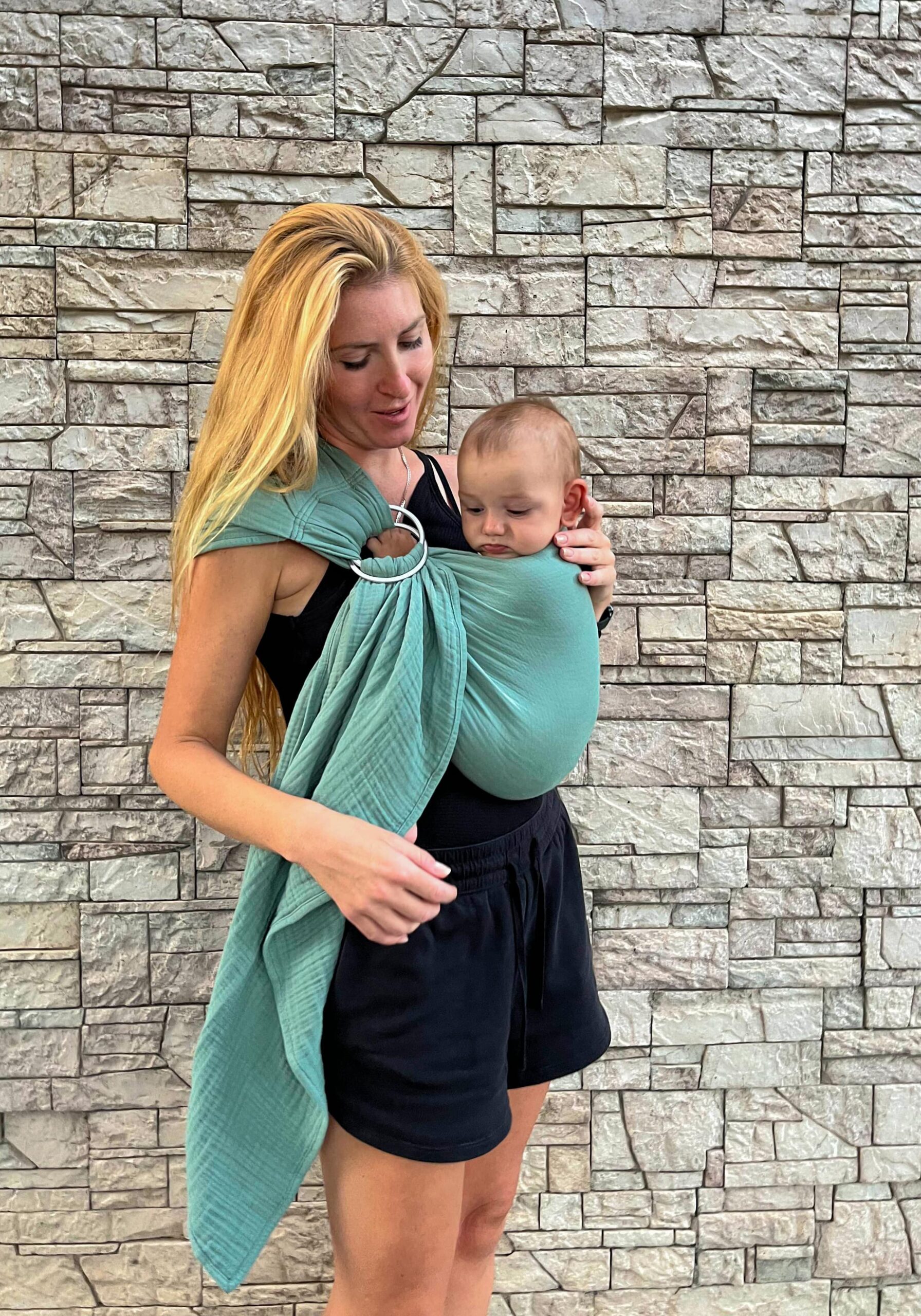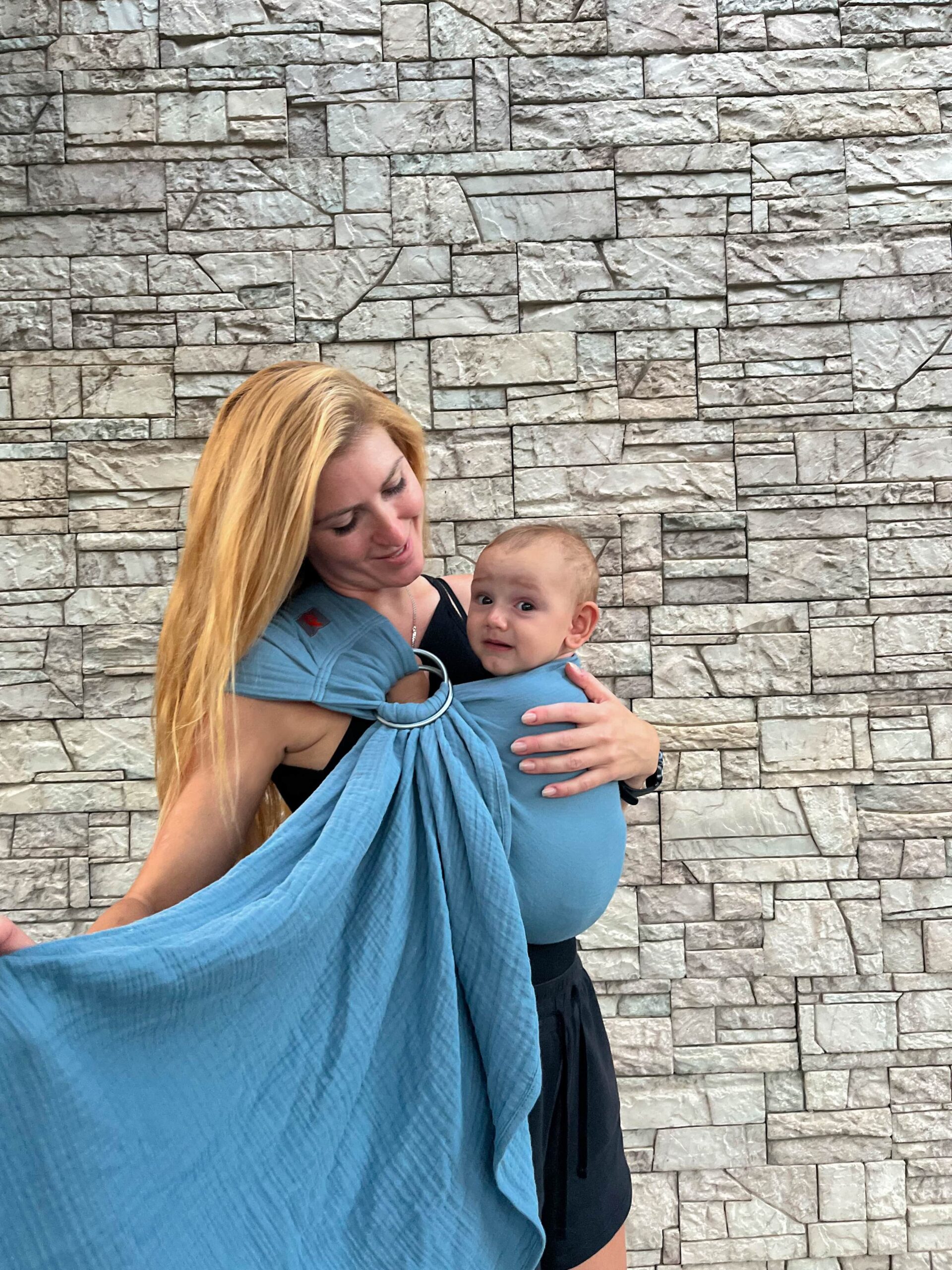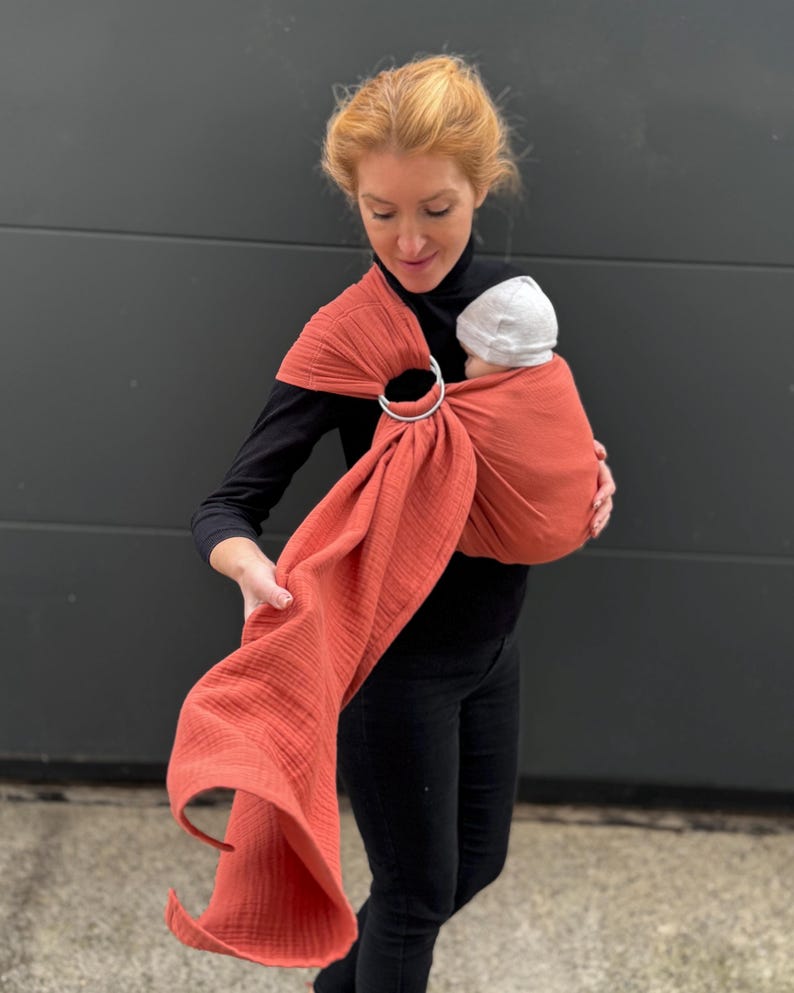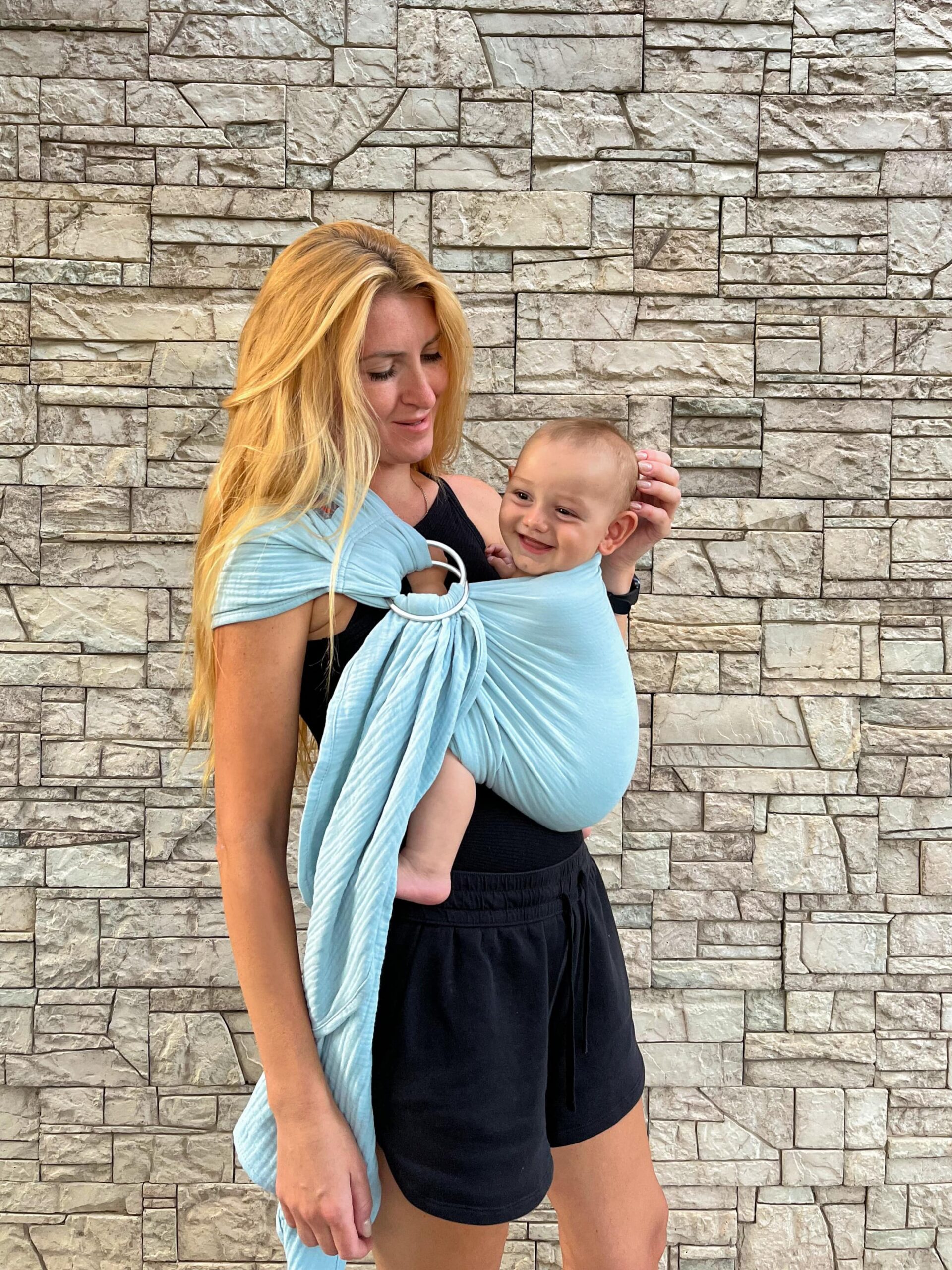 O Sling de Argolas Nashsling em musselina 100% algodão é leve, respirável e muito suave — perfeito para os dias quentes e para colos rápidos e confortáveis.