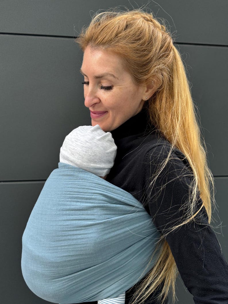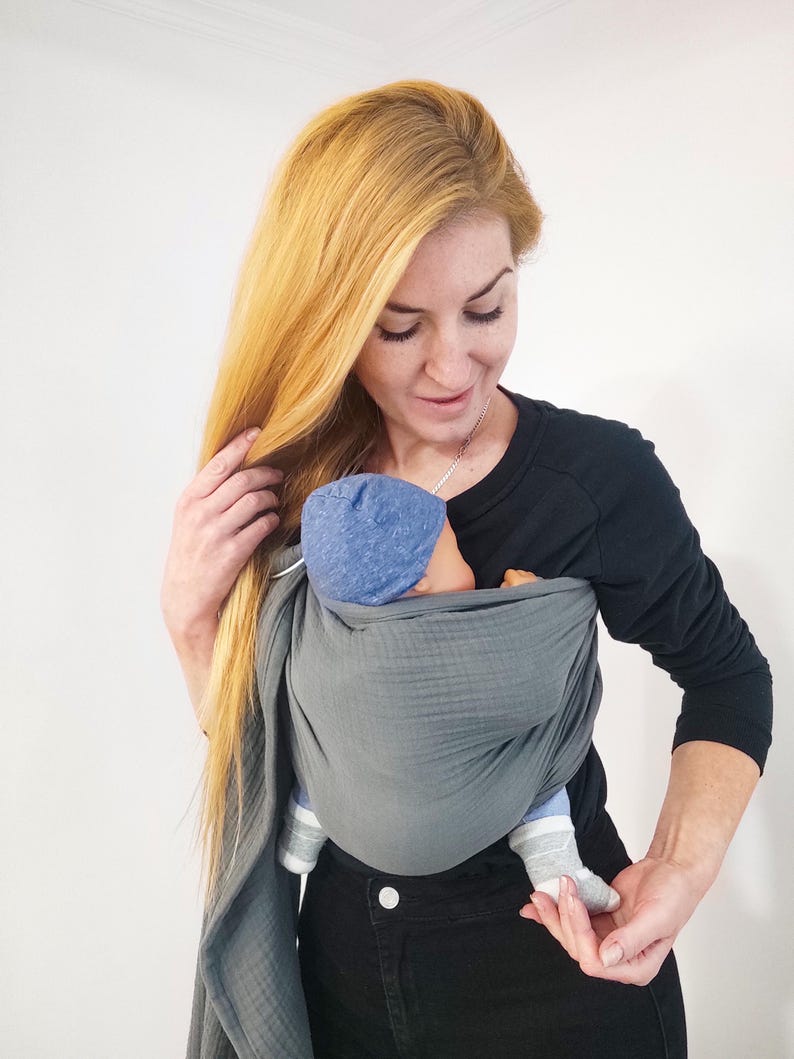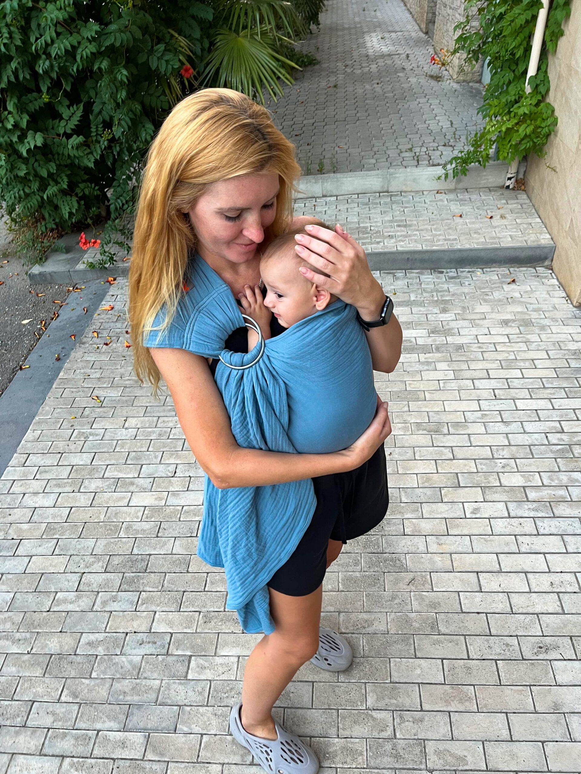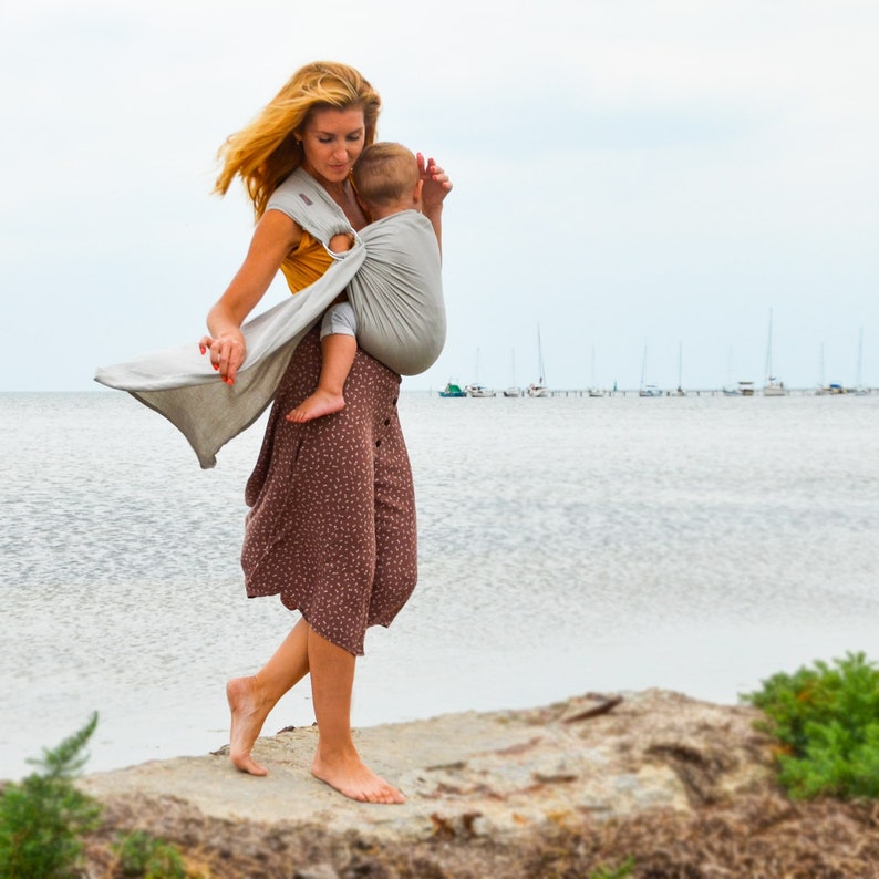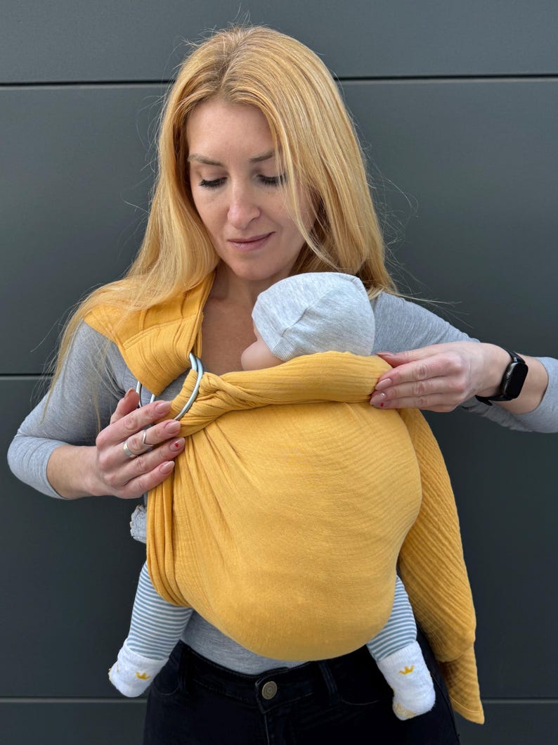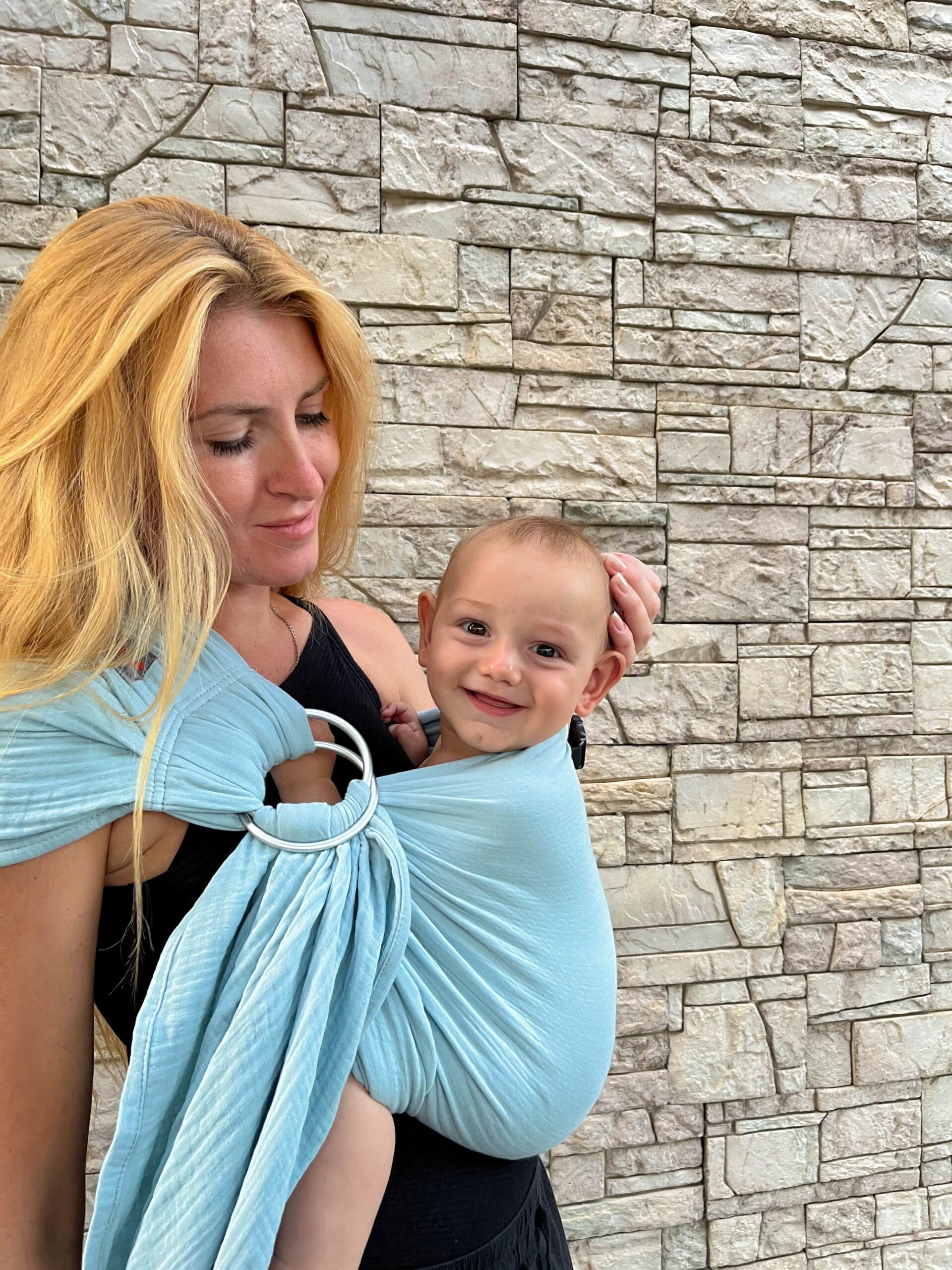 O Sling de Argolas Nashsling em musselina 100% algodão é leve, respirável e muito suave — perfeito para os dias quentes e para colos rápidos e confortáveis.