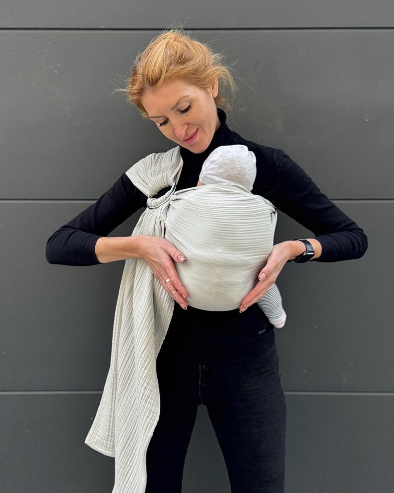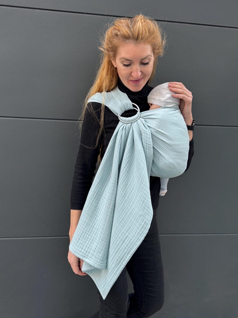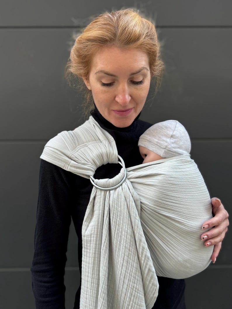 Sling de Argolas Nashsling em musselina 100% algodão — leve, respirável e ergonómico.